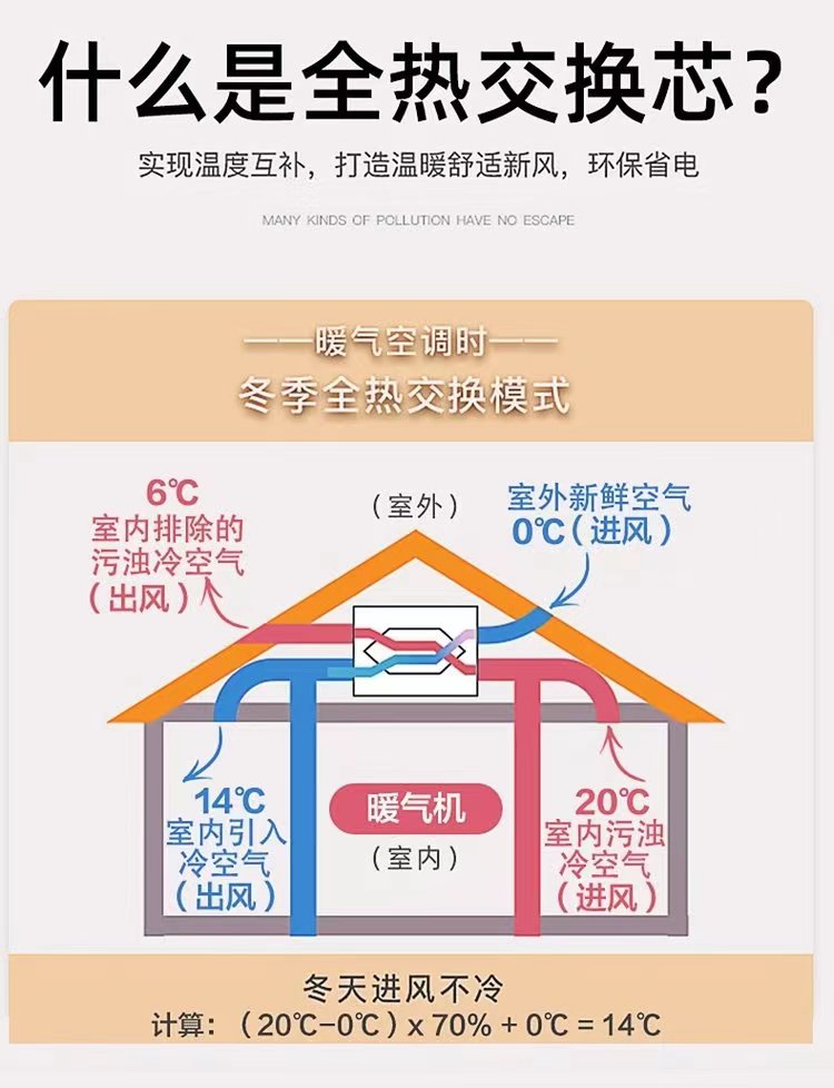 那在冬季的時候呢,還可以利用室內(nèi)暖氣的能量,對室外的冷空氣進行預(yù)熱,再送回室內(nèi),這樣室內(nèi)的暖氣的能量損失減少,并且可以給進入室內(nèi)的新風(fēng)加濕,因此無論是夏季還是冬季進入室內(nèi)的新風(fēng)都可以通過全熱交換芯體,從排出去的空氣中回收能量,從而降低能耗,節(jié)約能源,達到健康舒適環(huán)保的目的,另外全熱交換效率越高,交換時損失的能量也就越少,也會更加的節(jié)能。